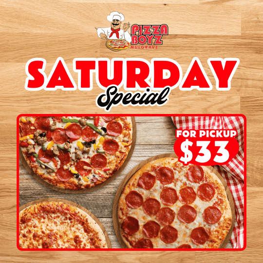 Saturday Special$333 large classic or traditional pizzas for $33Available day: Saturday- Single Combo$21.951x Large Pizza, 1x 1.25L Drink, Choice Of SML Cheesy Garlic Pizza Or Cheesy Garlic Bread